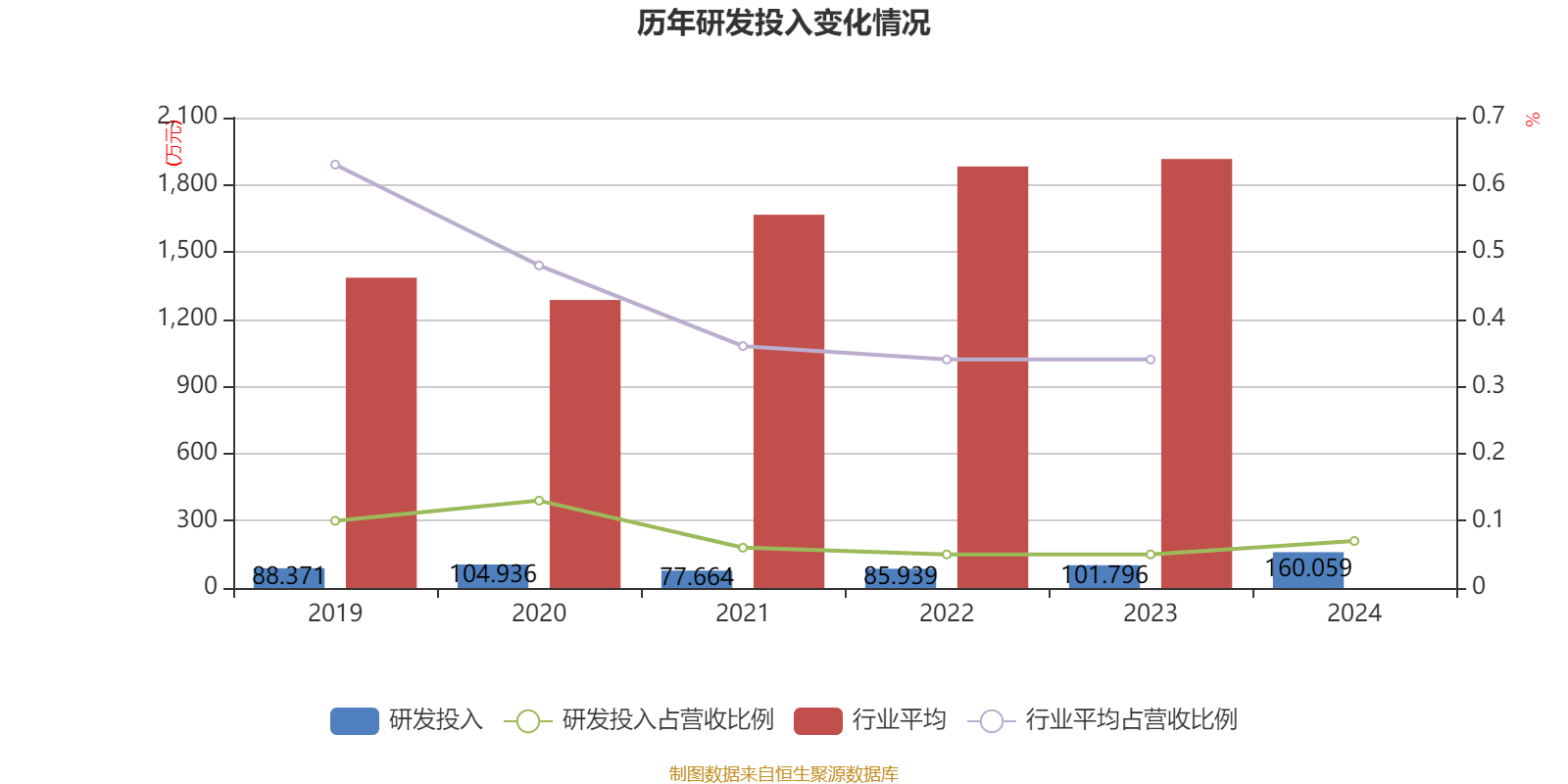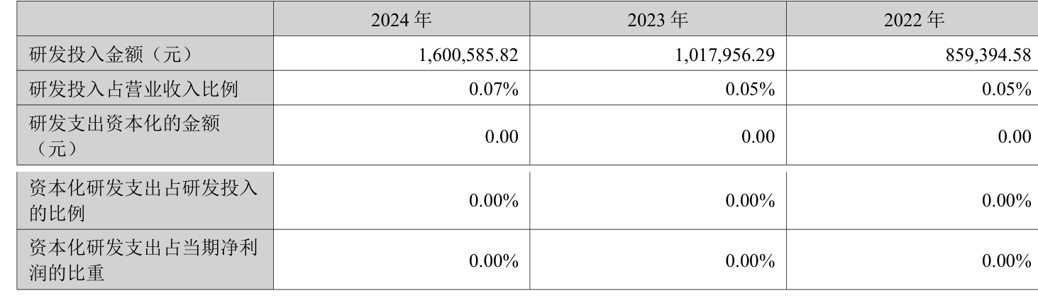 2024年全年,公司研发投入金额为160.06万元,同比增长57.24%;研发投入占营业收入比例为0.07%,相比上年同期上升0.02个百分点。此外,公司全年研发投入资本化率为0%。