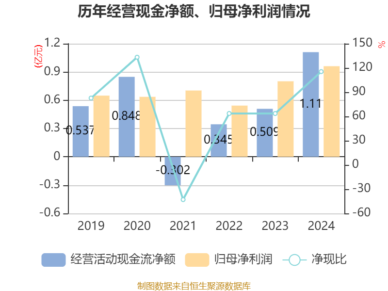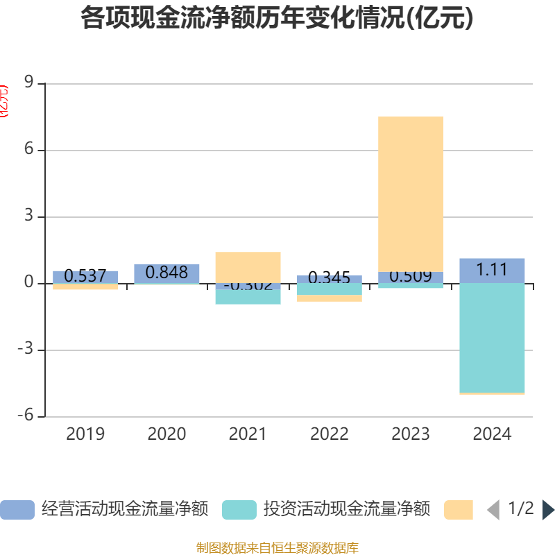 截至2024年,公司经营活动现金流净额为1.11亿元万通资本,同比增长117.93%;筹资活动现金流净额-884.94万元,同比减少7.08亿元;投资活动现金流净额-4.94亿元,上年同期为-2276.01万元。