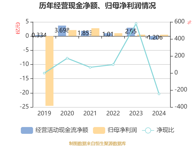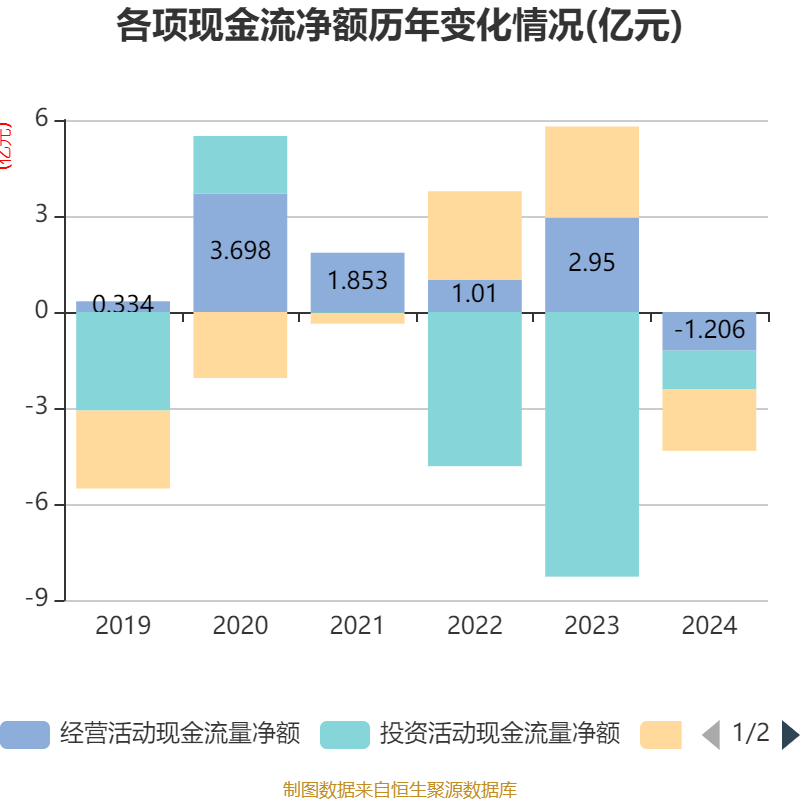 截至2024年,公司经营活动现金流净额为-1.21亿元,同比减少4.16亿元;筹资活动现金流净额-1.92亿元,同比减少4.76亿元;投资活动现金流净额-1.22亿元,上年同期为-8.27亿元。