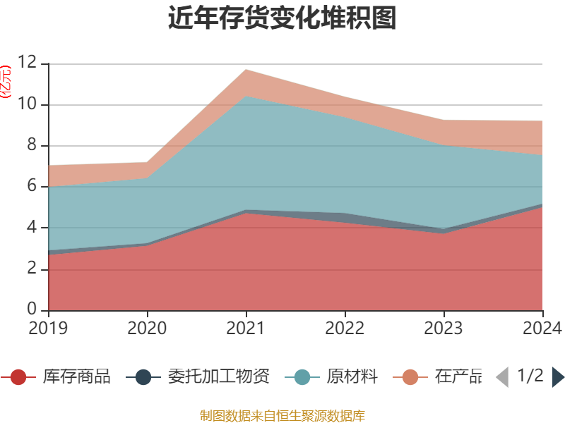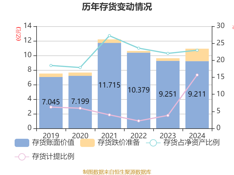 从存货变动来看,截至2024年末,公司存货账面价值为9.21亿元,占净资产的22.95%龙辉配资,较上年末减少401.31万元。其中,存货跌价准备为1.71亿元,计提比例为15.68%。