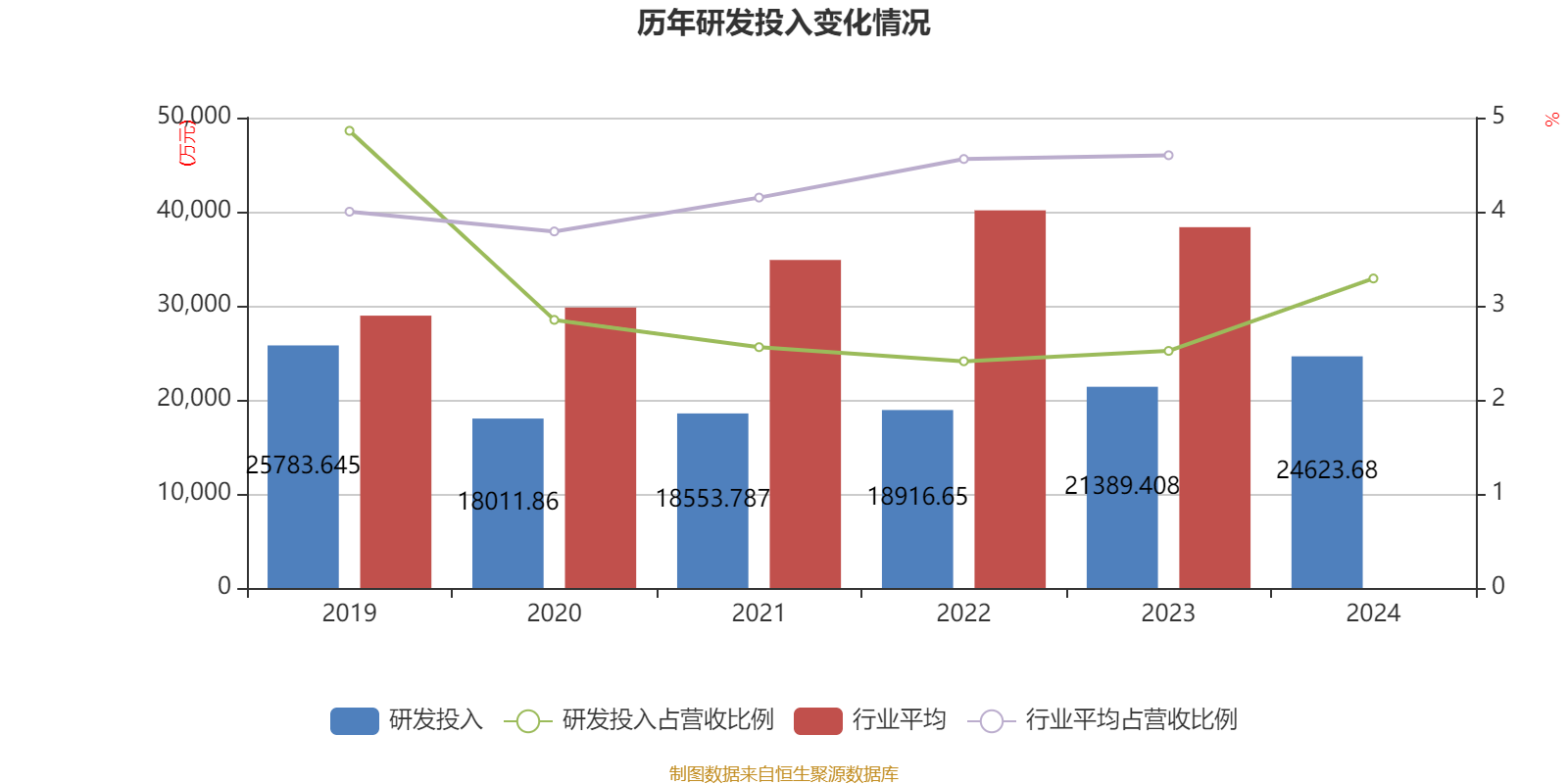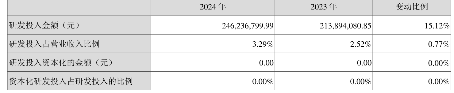 2024年全年,公司研发投入金额为2.46亿元,同比增长15.12%;研发投入占营业收入比例为3.29%,相比上年同期上升0.77个百分点。此外,公司全年研发投入资本化率为0%。